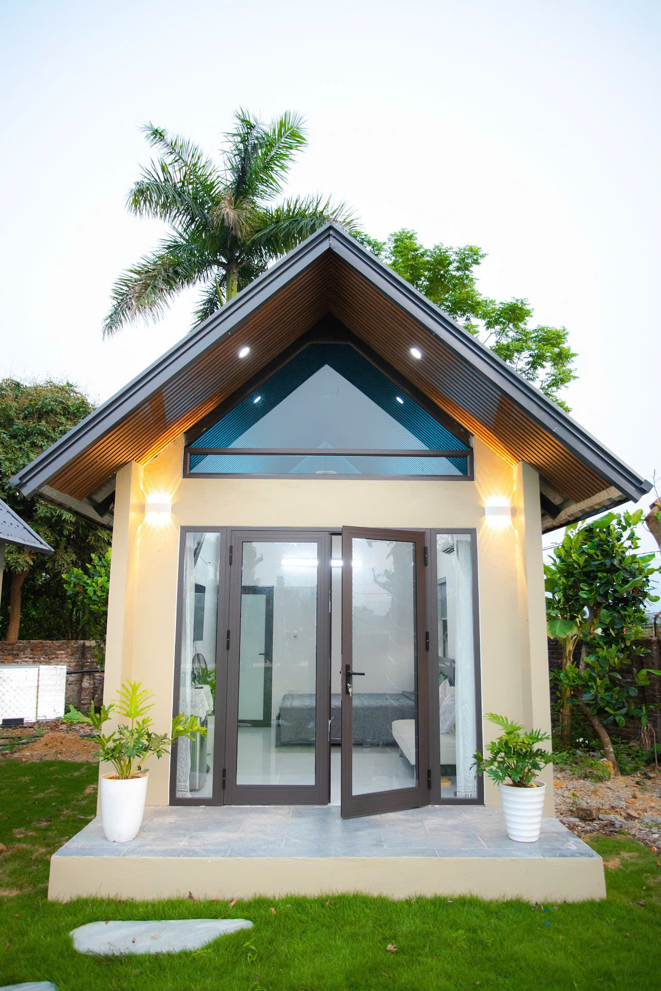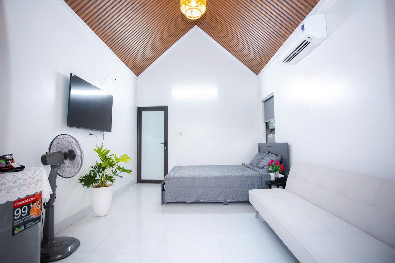 - 🌻 05 Bungalow 1 phòng ngủ – An Vui: mỗi phòng 1 giường 1.6m x 2m, phòng vệ sinh riêng, ghế sofa khu khách.